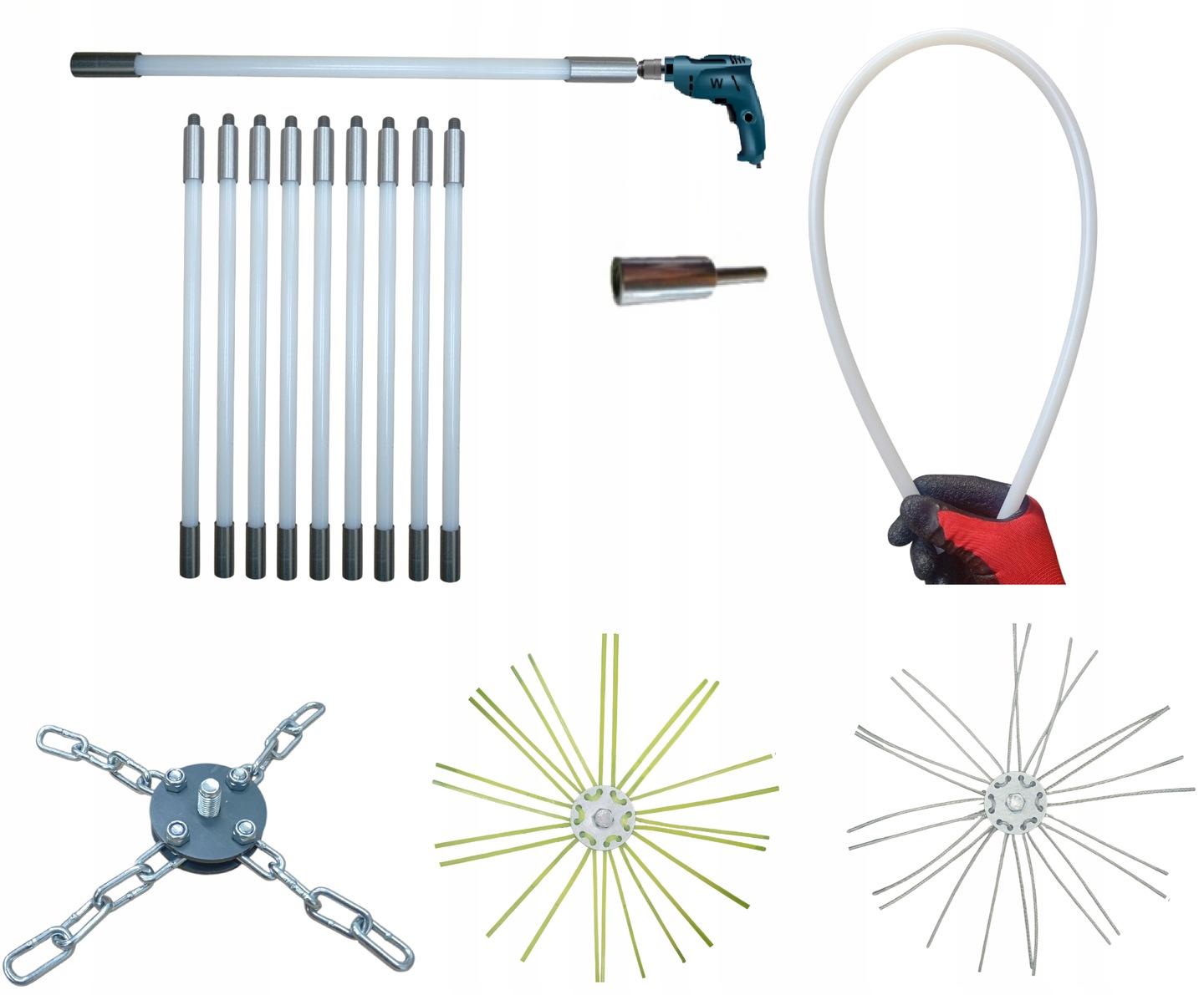 ZESTAW DO MECHANICZNEGO CZYSZCZENIA KOMINA OD DOŁU 9M + 3 GŁOWICE.