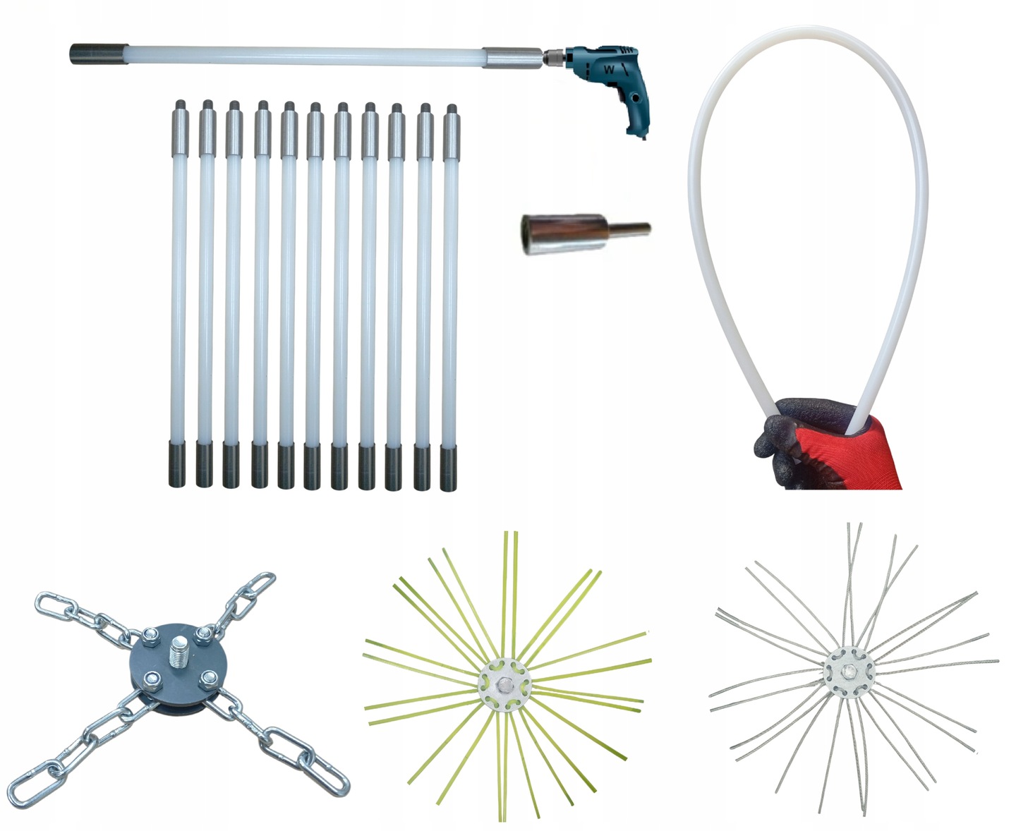 ZESTAW DO MECHANICZNEGO CZYSZCZENIA KOMINA OD DOŁU 11M + 3 GŁOWICE.