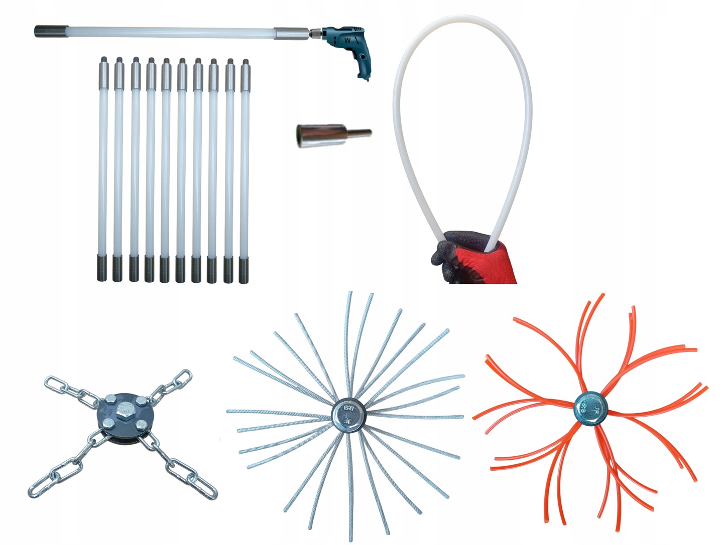 ESTAW DO MECHANICZNEGO CZYSZCZENIA KOMINA OD DOŁU 10M + 3 GŁOWICE.
