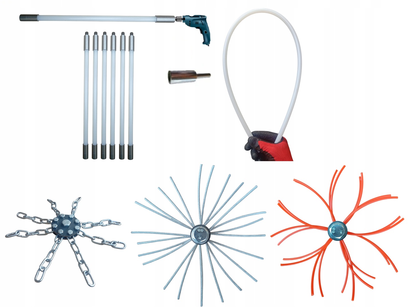 ZESTAW DO MECHANICZNEGO CZYSZCZENIA KOMINA OD DOŁU 6M + 3 GŁOWICE.