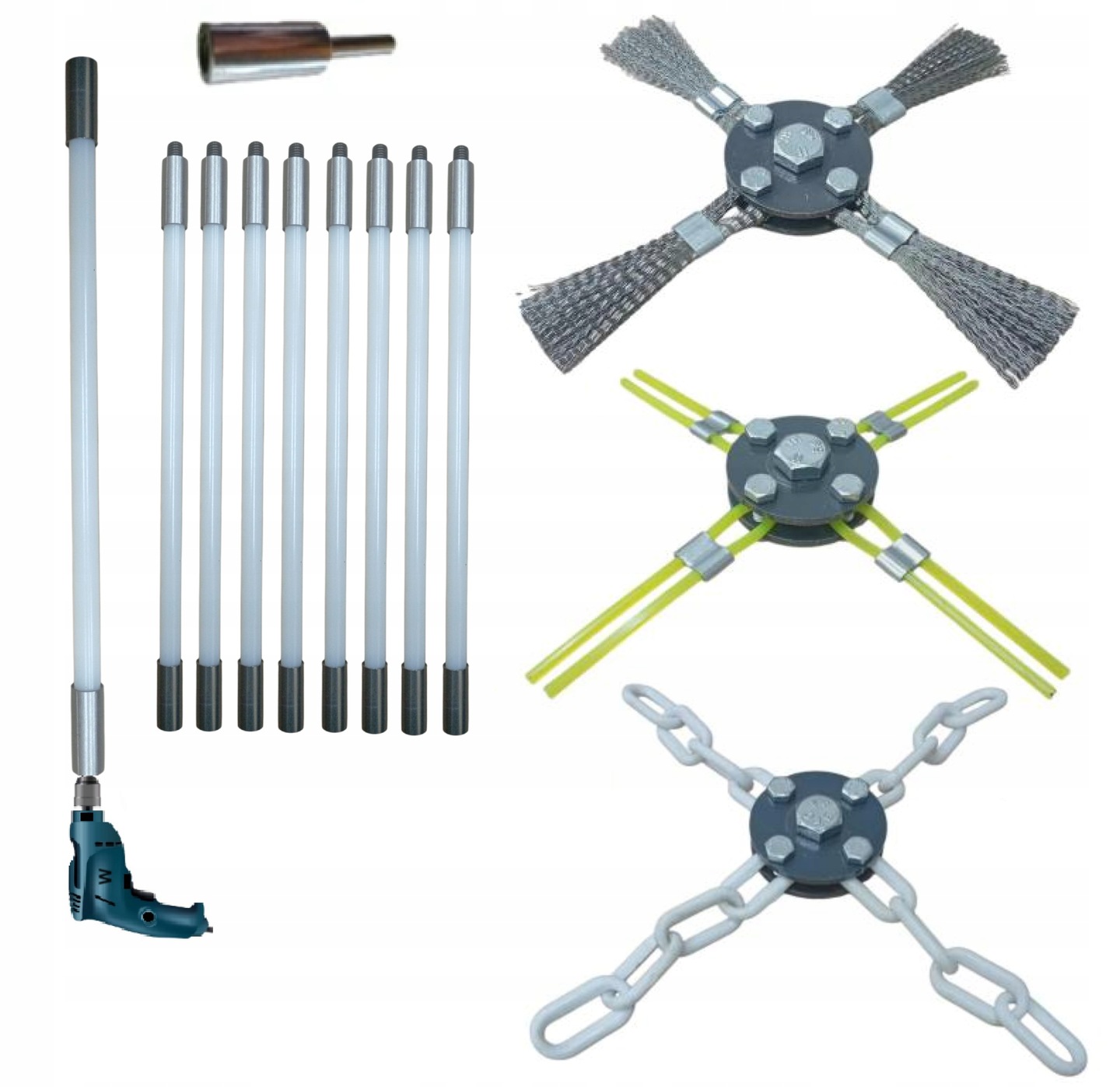 ZESTAW DO KOMINÓW KWASOODPORNY I NIERDZEWNYCH DO MECHANICZNEGO CZYSZCZENIA KOMINA OD DOŁU 8M + 3 GŁOWICE.