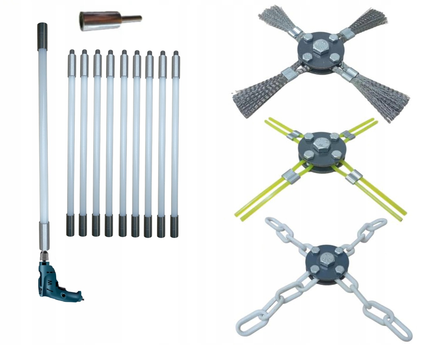 ZESTAW DO KOMINÓW KWASOODPORNY I NIERDZEWNYCH DO MECHANICZNEGO CZYSZCZENIA KOMINA OD DOŁU 9M + 3 GŁOWICE.